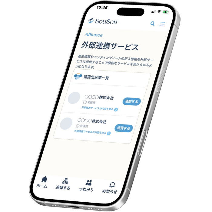 「SouSou」内で連携の意思表示をいただいた場合に、利用者様のご逝去情報をサービス提供事業者へ連携することが可能です。
