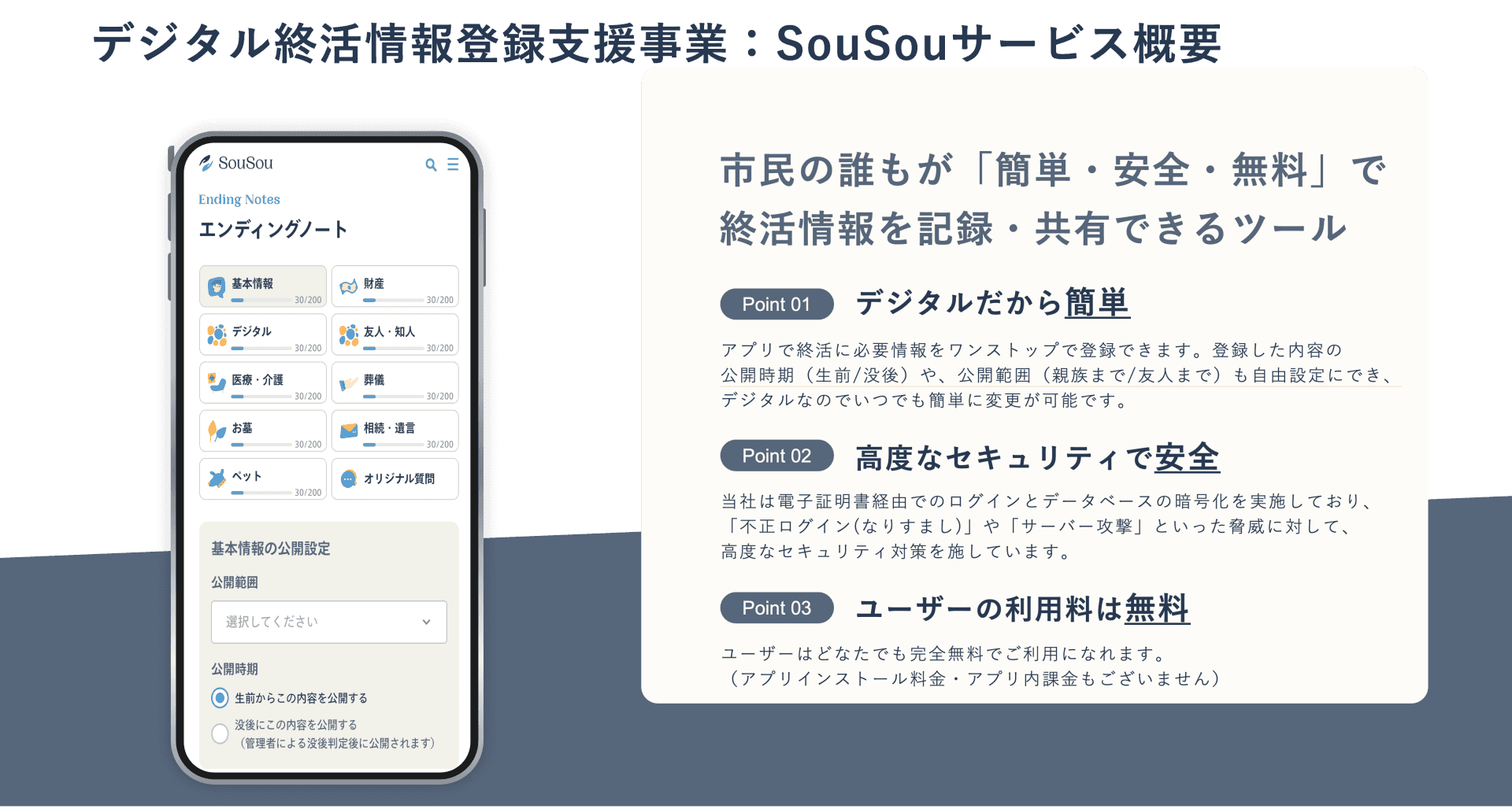 当社は、自社サービスであるエンディングプラットフォーム「SouSou」を活用することで、この仕組みをスムーズにデジタル化することができることを提案。誰もがスマートフォンアプリから終活情報を登録・更新できるようになる上に、「SouSou」の特徴である