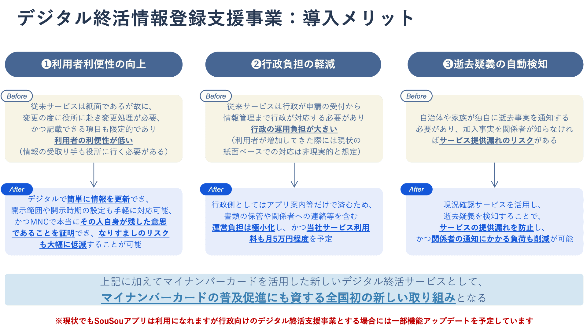「SouSou」はマイナンバーカードを活用した新しいデジタル終活サービスです。エンディングノート等の終活に必要な様々な機能を、アプリ利用料金完全無料・ワンストップで提供します。また従来のサービスにはない「①.本人性/真正性の担保」・「②.逝去判定のデジタル化」・「③.外部サービス(データ)連携」という3つの特徴を備えており、今後は様々なパートナー企業との連携を通じて、ご逝去後の各種手続きの自動化・簡略化を目指します。