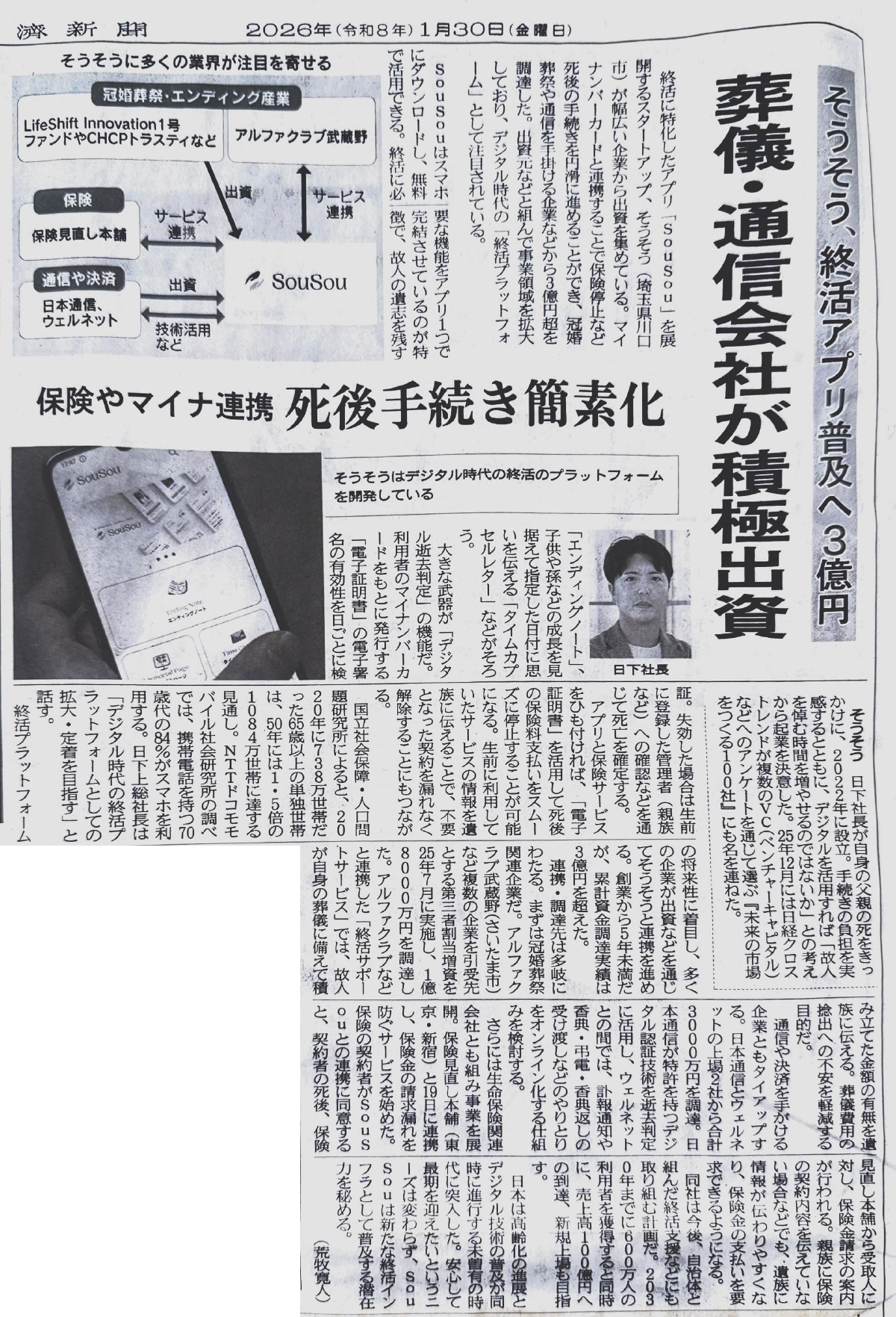 記事では、当社が提供する終活アプリ「SouSou」におけるマイナンバーカードと連携した「デジタル逝去判定」機能や、終活に必要な機能をアプリ一つで完結できるサービス設計、さらには保険・葬祭・通信・決済など多分野の企業との連携実績が取り上げられ、デジタル時代の「終活プラットフォーム」としての成長可能性に注目が寄せられています。